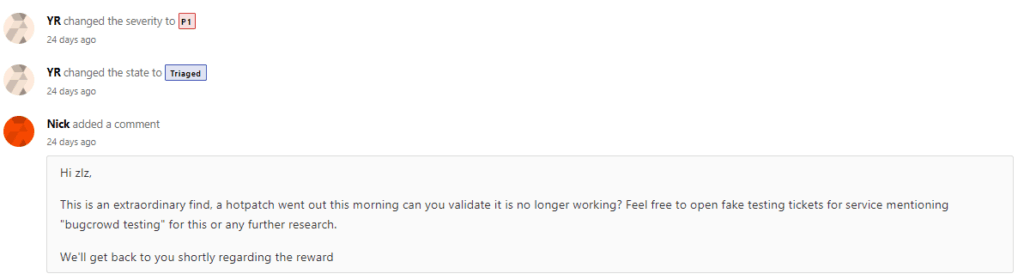 At nearly 2:00 AM in the morning (after driving for 11 hours) I manically wrote a report to the Tesla bug bounty program. They triaged it as a P1, commented, and pushed out a hot fix within 12 hours.