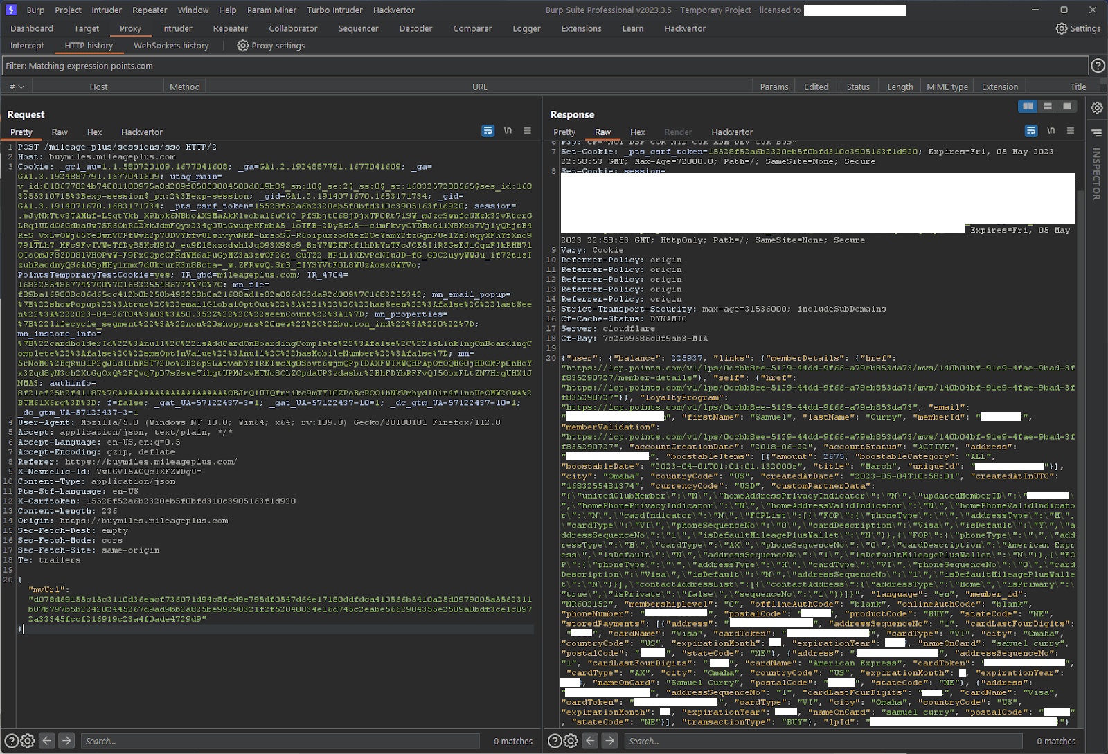 The HTTP response contained the member's authorization token, something that we previously learned is used to retrieve their information and transfer miles on their behalf!