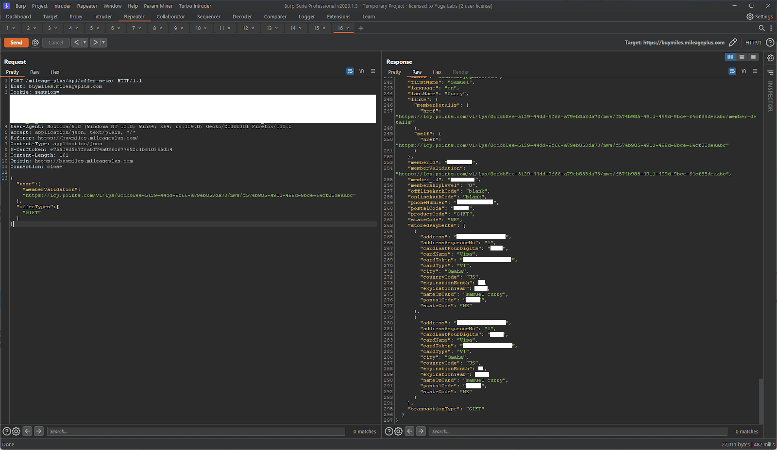 The vulnerability worked like this: by sending their first name, last name, and rewards number through the normal website UI for adding a points recipient, the server would return an authorization token in the HTTP response which could be used to retrieve their billing address, phone number, email, redacted credit card information, and billing history. We could additionally transfer miles on their behalf using this token.