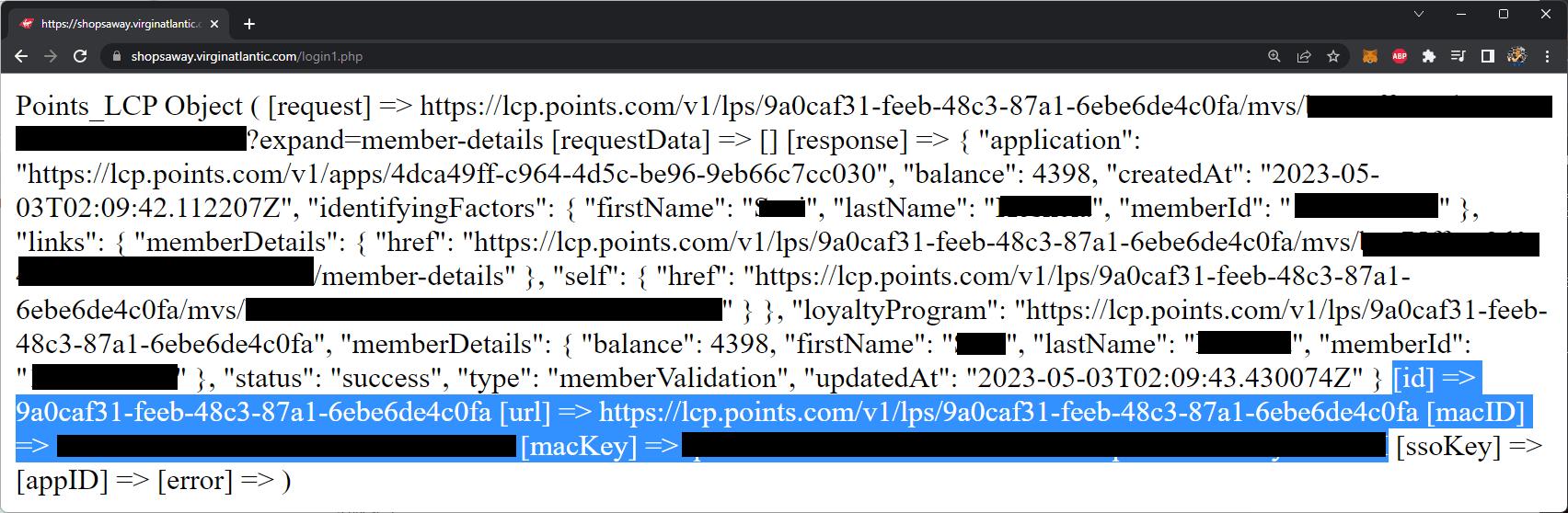 On May 2nd, 2023, we discovered an endpoint on a points.com-hosted Virgin rewards website that leaked the "macID" and "macKey" used by Virgin to authenticate to the core points.com API on behalf of the airline. The credentials could be used to fully authenticate as the airline to the "lcp.points.com" API by signing HTTP requests using the disclosed secret, allowing an attacker to call any of the API calls intended for the airline like modifying customer accounts, adding/removing points, or modifying settings related to the Virgin rewards program.